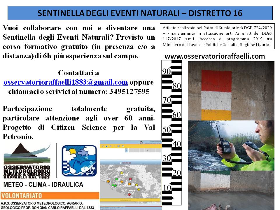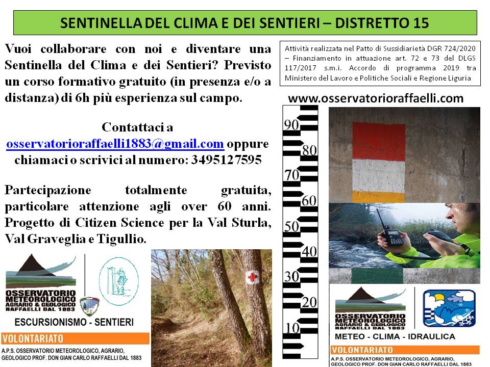 Riguardano la creazione della figura della Sentinella del Clima e dei Sentieri e la Sentinella degli Eventi Naturali, una figura volontaristica di cittadino scienziato (citizien science) dove con un semplice cellulare, abilitato al servizio fotografico e alla connessione di rete anche accedendo al wi-fi, può trasmetterci foto, video e testi di quanto osserva intorno a se stesso nel luogo dove si trova al momento in cui si verificano determinati eventi naturali o antropici.
