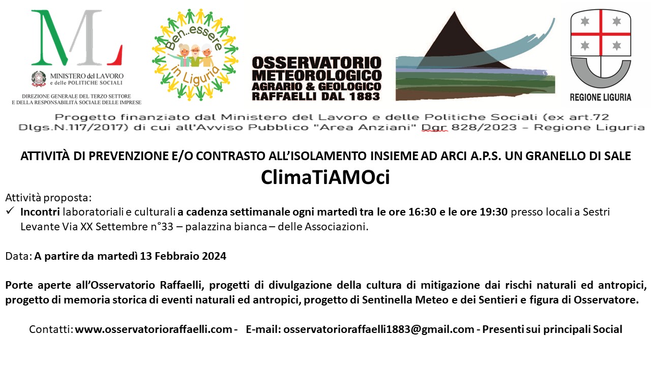 Da martedì 13 Febbraio 2024 potete venire a conoscere l’Associazione e a seguire i laboratori che realizzeremo presso la struttura civica situata a Sestri Levante in Via XX Settembre n°33 – palazzina bianca – detta anche delle Associazioni – ove ha anche la sede l’Auser Tigullio.